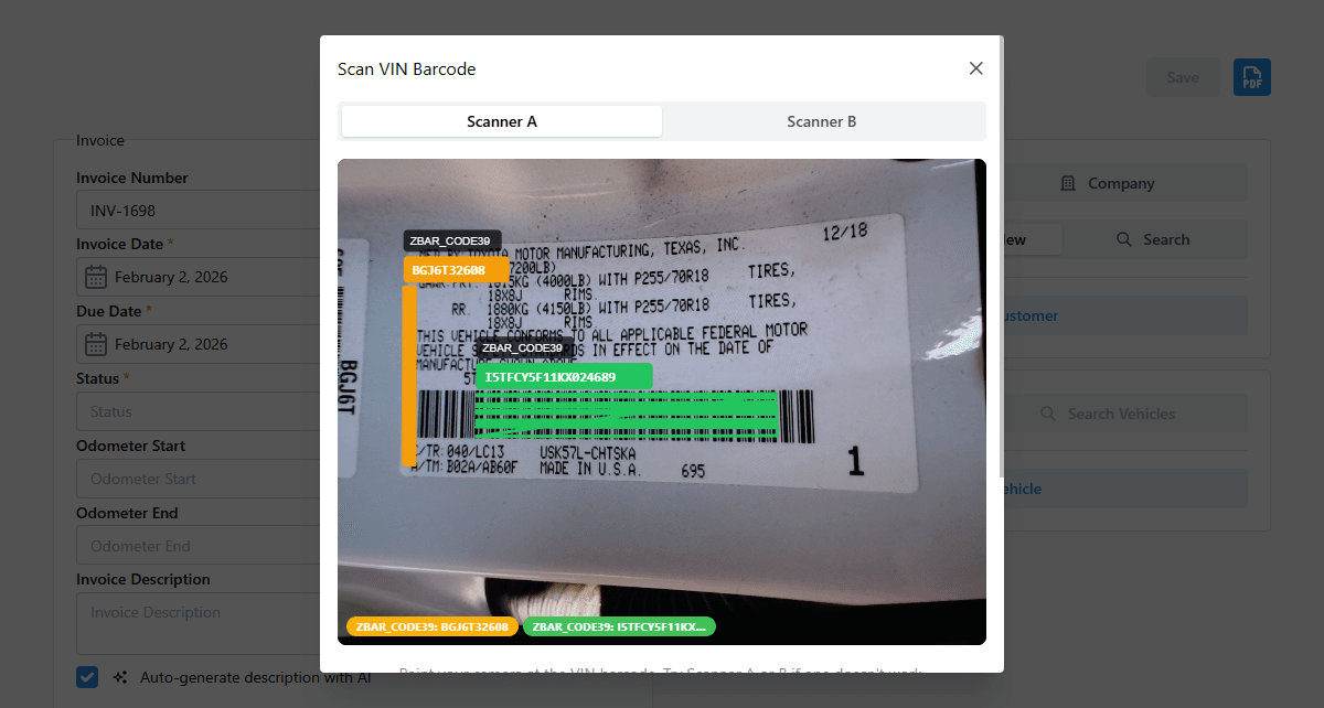 Speed up intake by scanning the VIN barcode to automatically populate year, make, model, and engine details—no manual entry required.